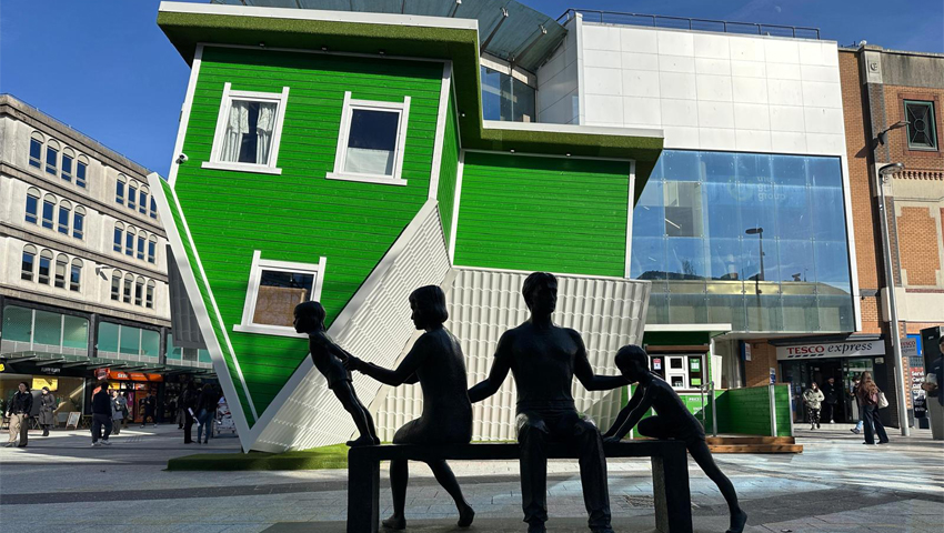 Upside Down House Cardiff is located on Queen Street, adjacent to The Capitol Shopping Centre. Visitors arriving by train can reach it easily from Cardiff Central station, while nearby parking is available at St David’s Dewi Sant, Capitol Shopping Centre, and NCP Dumfries Place.