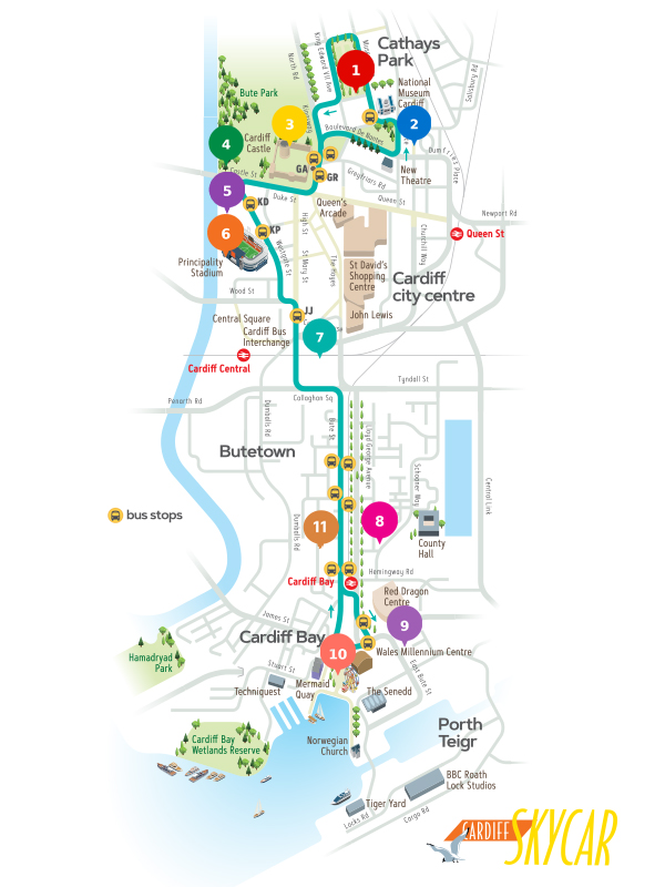 As you roll through the city, there’s loads to see en route. Scroll down to discover fun facts about the attractions you’re passing, numbered 1-11 on the map. If you’d like to hop off the bus at any point, the stops are highlighted with yellow icons. If you’d like to see a list of the stops please check the Cardiff Bus app or by clicking here. Let the adventure begin.